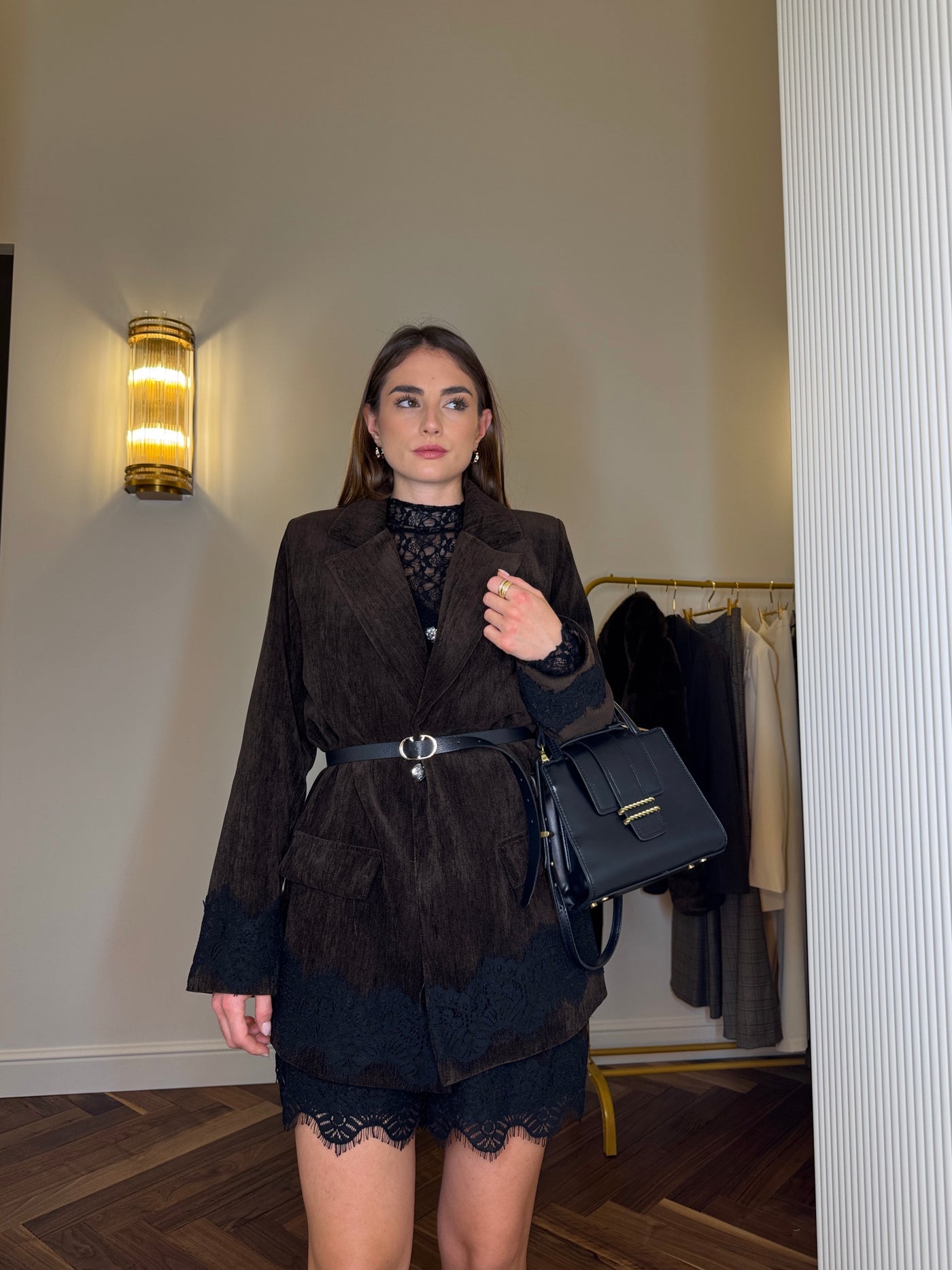 Blazer in velluto con delicati dettagli in pizzo, cintura in vita e linea elegante. Un capo sofisticato, ideale per look serali e occasioni speciali.