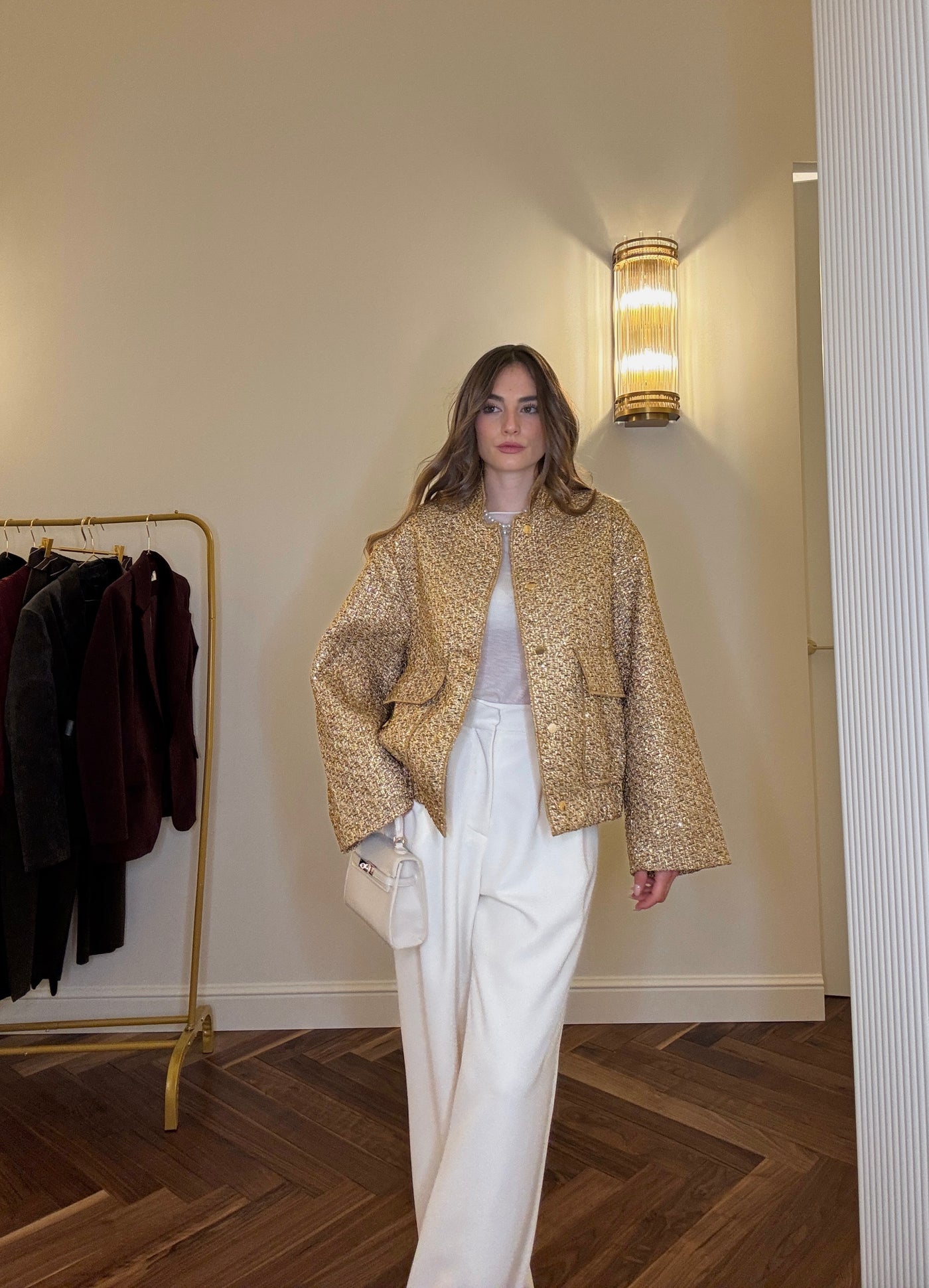 Giacca dal tessuto strutturato e luminoso, dal gusto raffinato e femminile. Perfetta per valorizzare anche i look più essenziali.