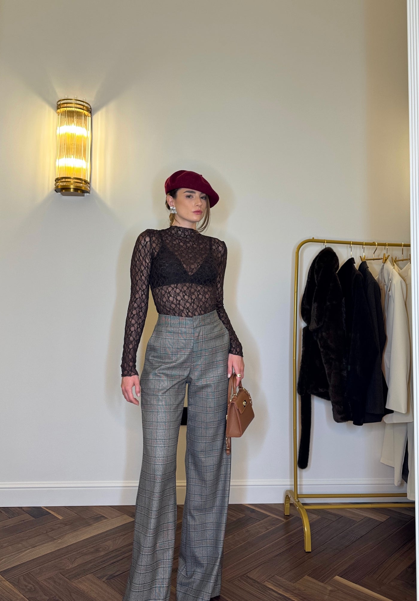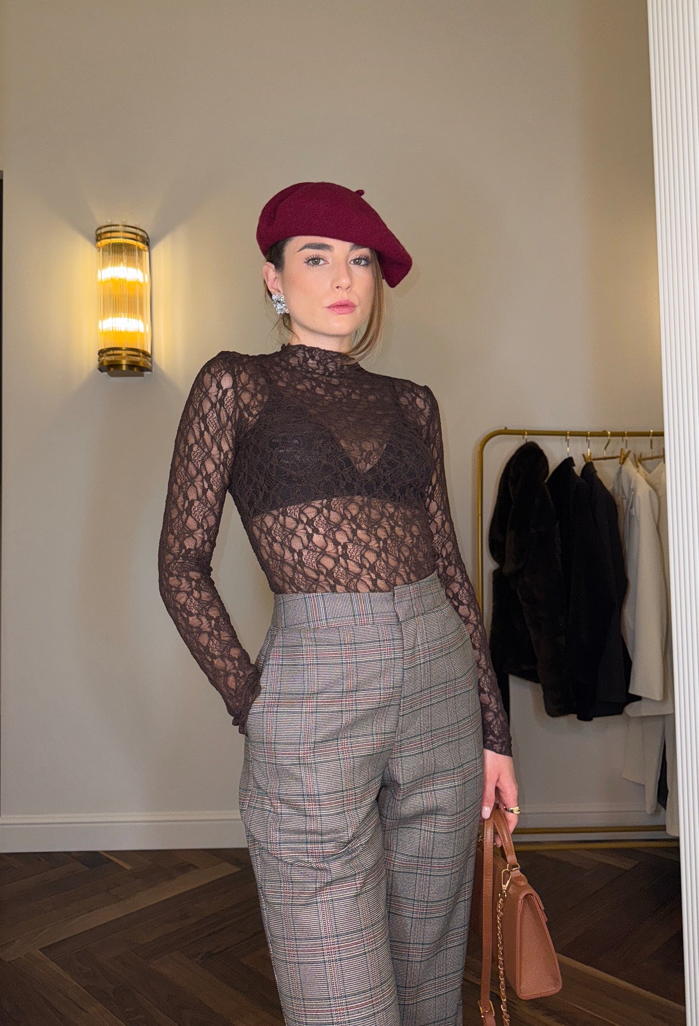 Il pizzo in tonalità marrone avvolge la silhouette con delicatezza, creando un gioco di trasparenze raffinato e mai eccessivo.